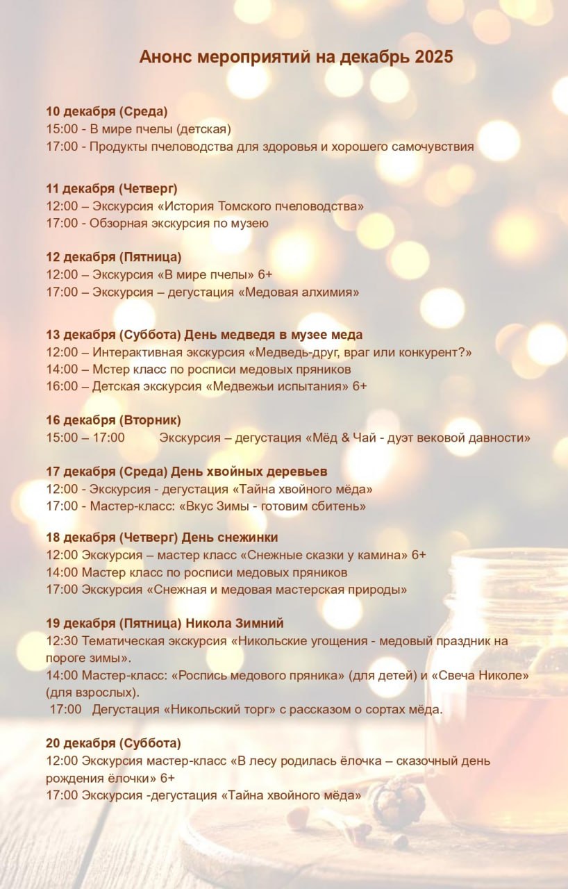 Друзья, мы подготовили для вас насыщенную программу на декабрь! В нашем музее меда «Пчелотека» вас ждут увлекательные экскурсии, творческие мастер-классы и, конечно, знакомство с удивительным миром пчел.